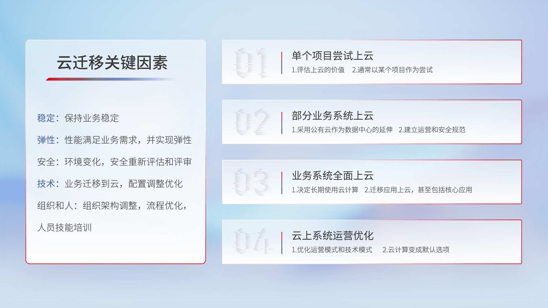 结合实际业务,,,,从规划设计、、、、云平台选型、、、云原生改造、、、、数据迁移、、集成交付,,,,迁移全过程为客户识别最佳上云路径,,做好风险识别管理,,,,设计网络架构、、、、身份权限、、、、安全审计合规、、操作审计、、、日志审计、、、、监控告警策略、、、、多站点容灾设计等,,,对云上基础设施进行整体规划,,,,提升IT治理水平,,以满足弹性、、、、高可用、、、高性能的需求。。