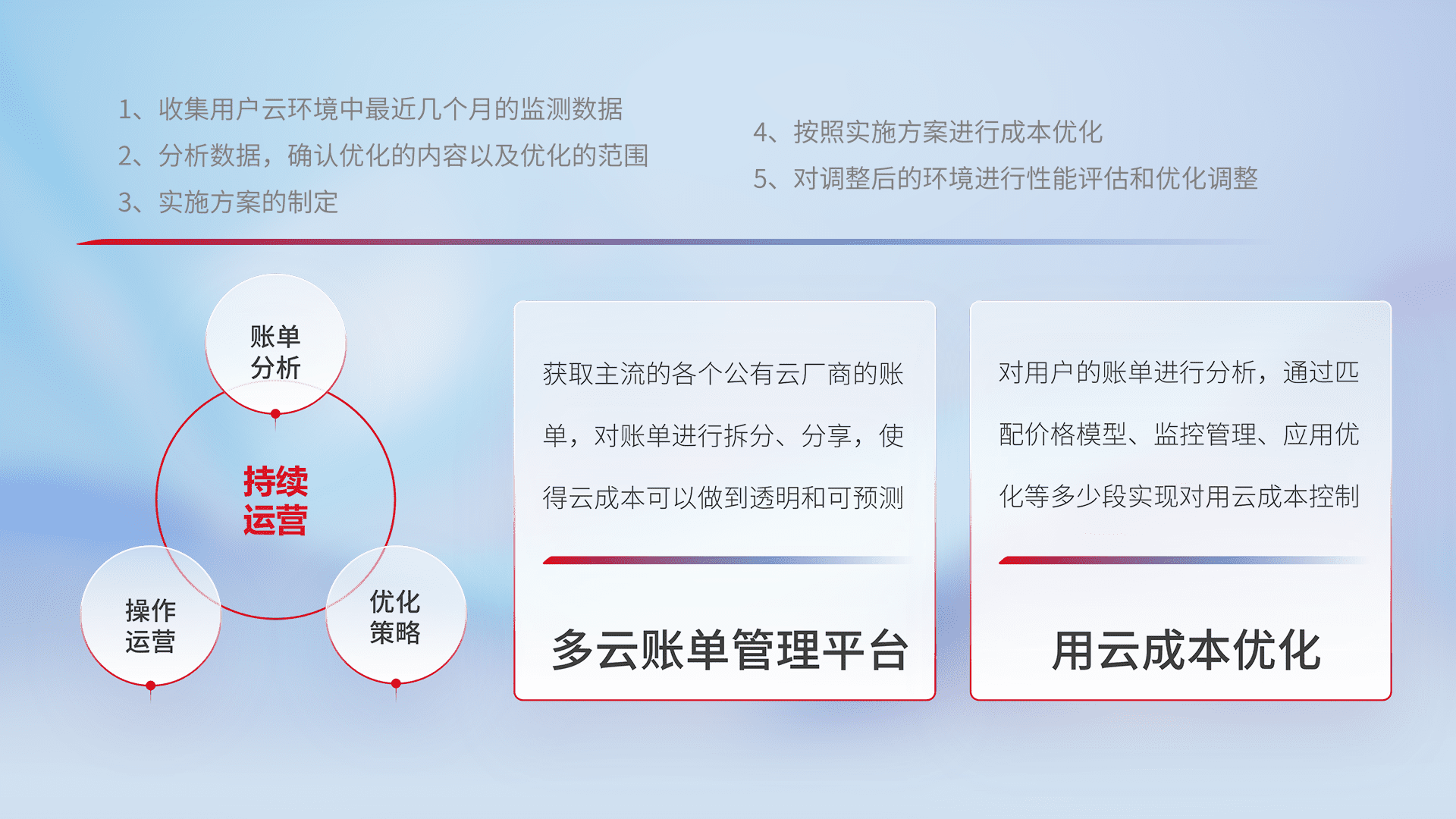 通过多云纳管,,以统一的资源数据模型把客户的云资源进行抽象和封装,,,进而实现对多云资源的统一操作,,,,保障云资源管理的可靠性、、、、稳定性与可用性。。。。量身定制化运维内容,,,,配置、、、、开发运维、、、、补丁管理、、、备份、、监控、、认证和访问管理、、、审计和日常巡检等,,,,保障在用云过程中的可靠度,,,,稳定度以及高可用率。。。