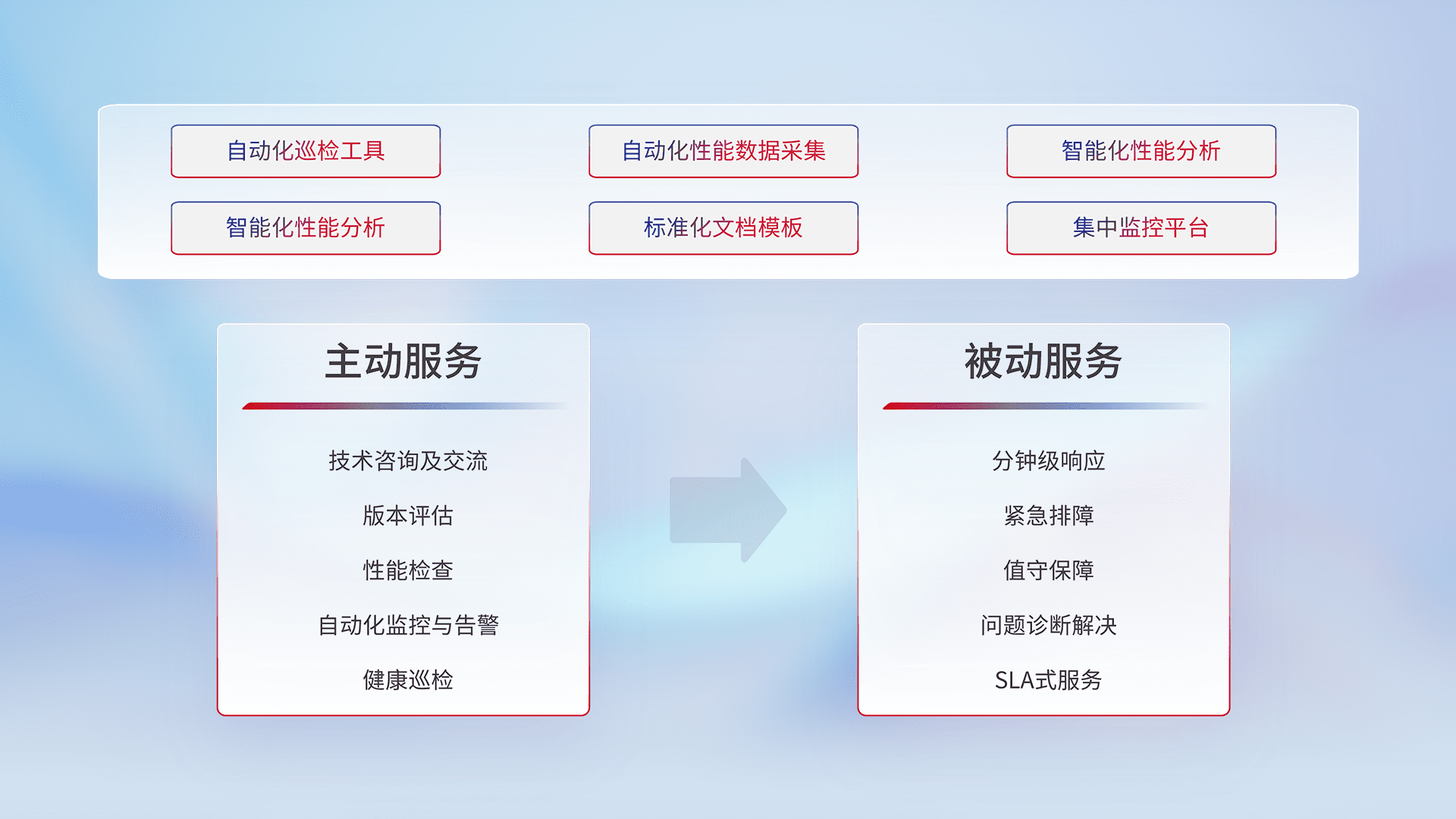 智能化工具和标准化文档,,,保障服务质量,,,提供主动服务(包含技术咨询、、版本评估、、、、性能检查、、、、自动化监控与告警、、、健康巡检)和被动服务包含(分钟级响应、、紧急排障、、、值守保障、、、问题诊断解决、、SLA服务)。。
